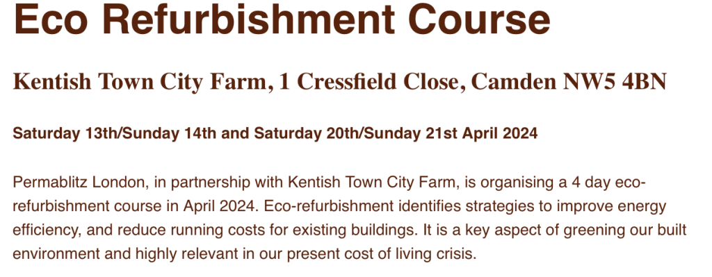 Permablitz London is running an eco-refurbishment course at Kentish Town City Farm in April 2024.